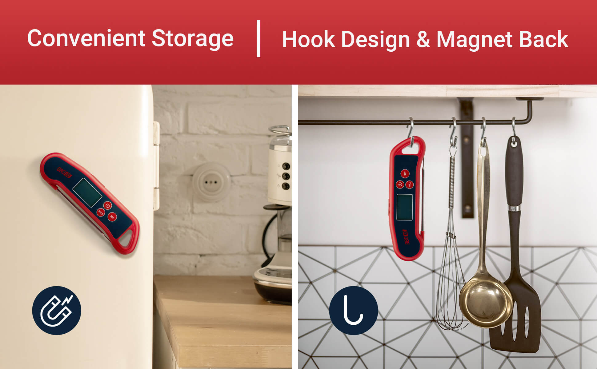Convenient Design: Splash proof, you can easily clean the thermometer with a wet cloth when it is covered with dirt; Strong magnetic back and hook, make storage easy, you can hang it somewhere with a nail or just attach it to metal surfaces of the home appliance; Powered by 2 AAA batteries, which can be found in almost everywhere in the world, users will no longer need to worry about the battery model.